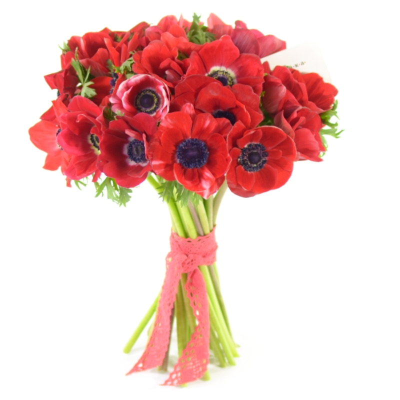 Букет состоит из 29 красных анемонов, прозрачная упаковка, атласная лента.