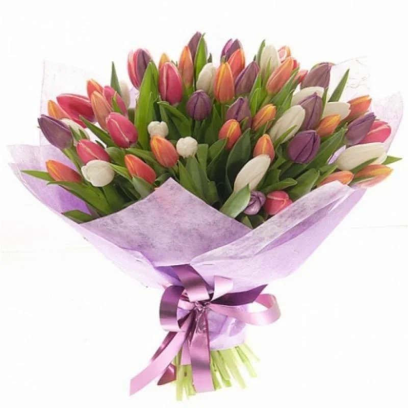 Букет состоит из MIX из 51 тюльпана, красивая упаковка, атласная лента.