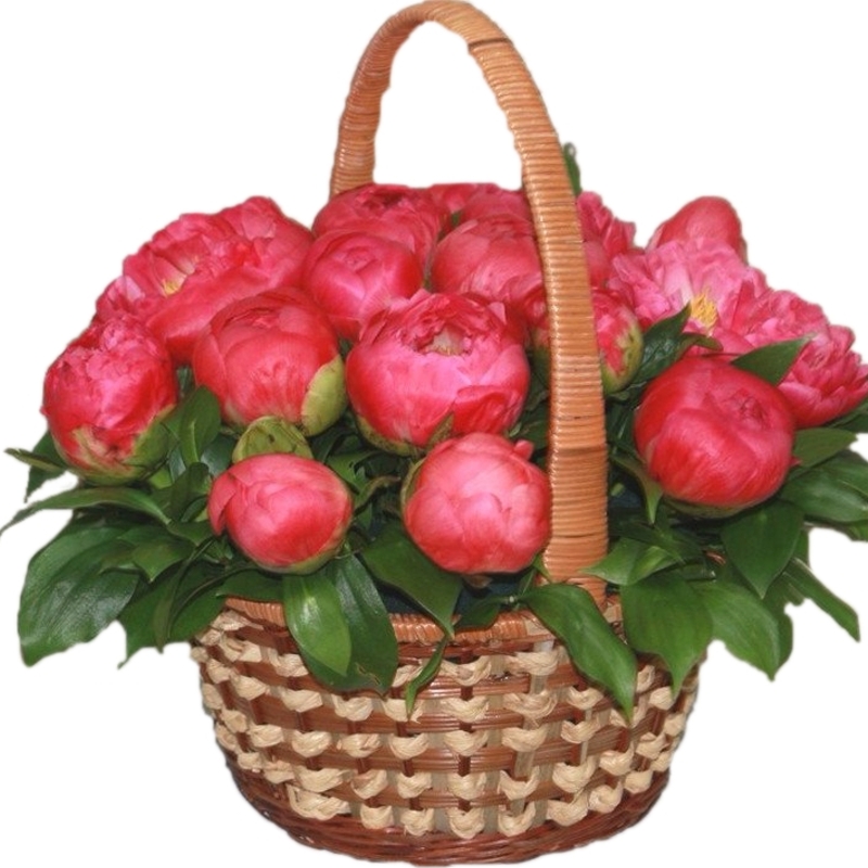 Букет состоит из 23 красных пионов, зелень, корзина, оазис.