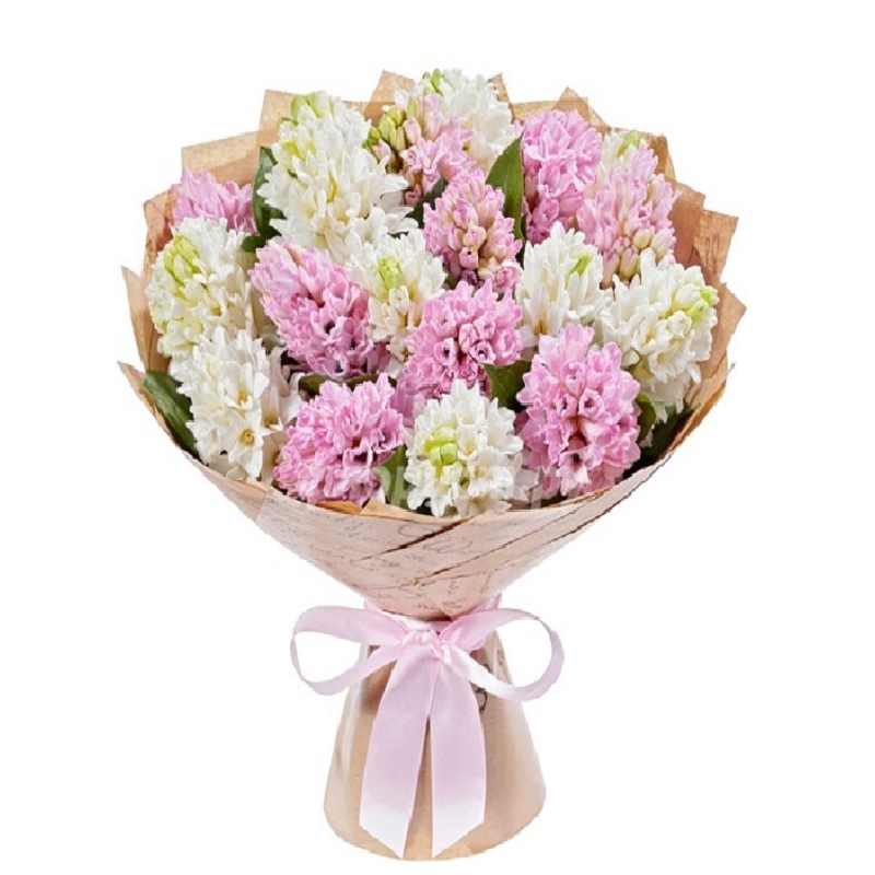 Букет состоит из MIX из 19 гиацинтов, крафт, атласная лента.