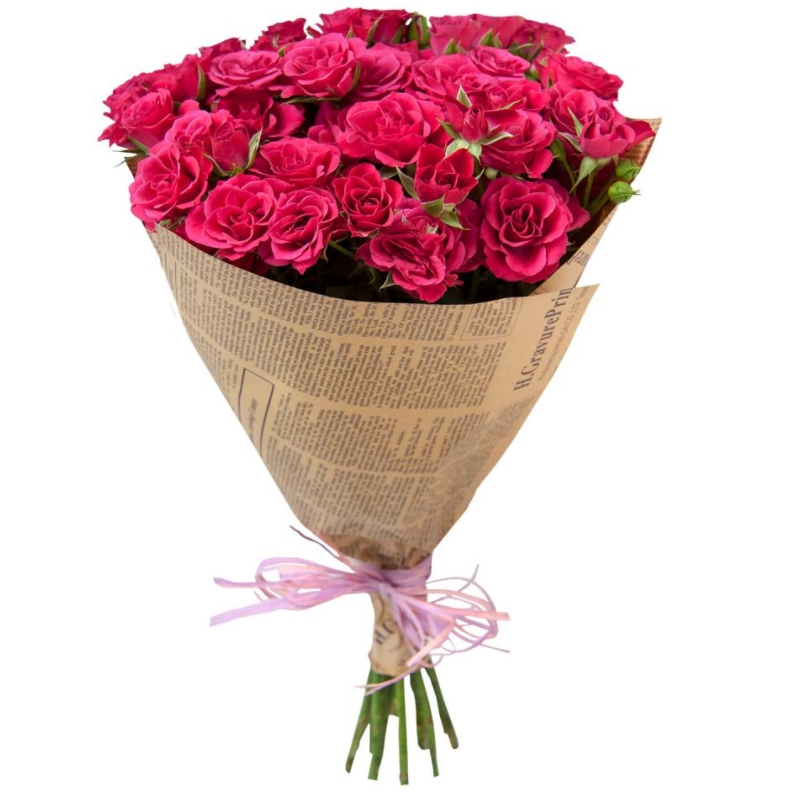 Букет состоит из 17 веток малиновых кустовых роз, крафт, атласная лента.